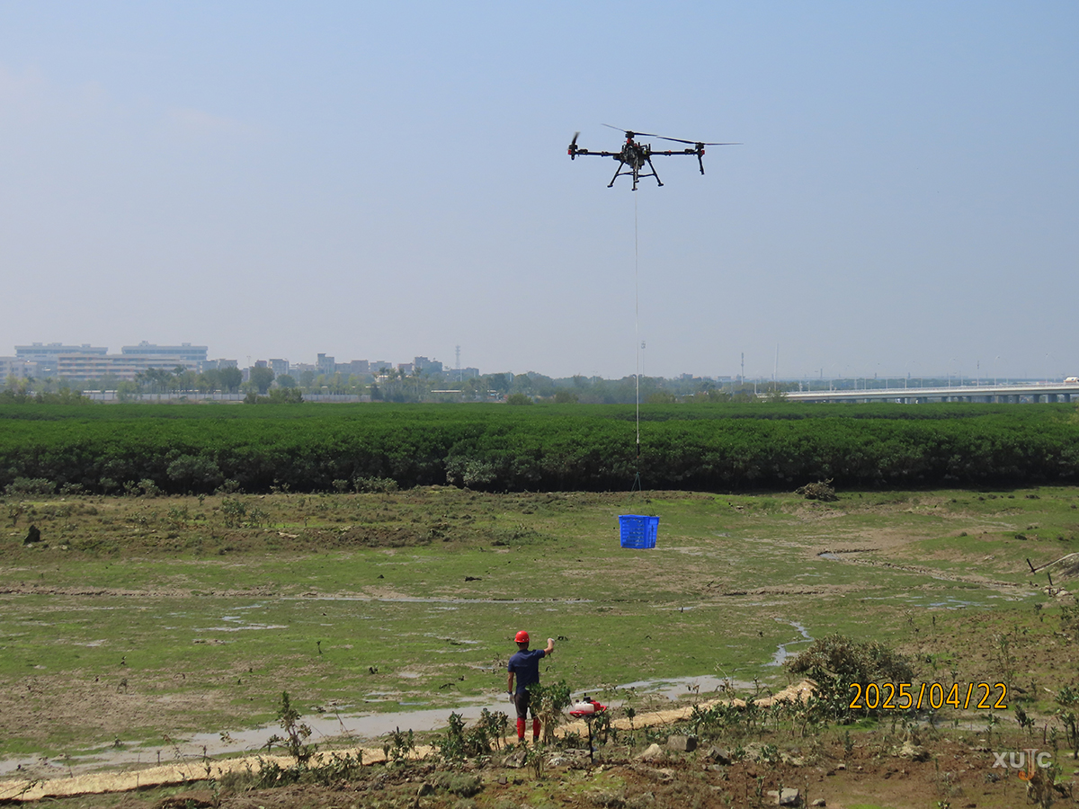 无人机喷洒技术,即利用P150无人机模拟防病虫害喷洒任务,这项技术可大大提高喷洒效果和防除效率。无人机采样技术,即使用厦大开发设计的T20无人机采样设备进行采样。此项创新技术实现采样可视化,并能精准定位,有效解决了滩涂采样行进困难的问题,为红树林研究提供了新的采集手段。困难地钻土技术,即使用专业钻土设备对部分泥土坚硬的区域,进行土质疏松与打孔作业,为红树林的生长创造更好的土壤条件。无人机运输技术,即使用P150无人机搭配运输系统,将本次种植的部分苗木安全运至滩涂。