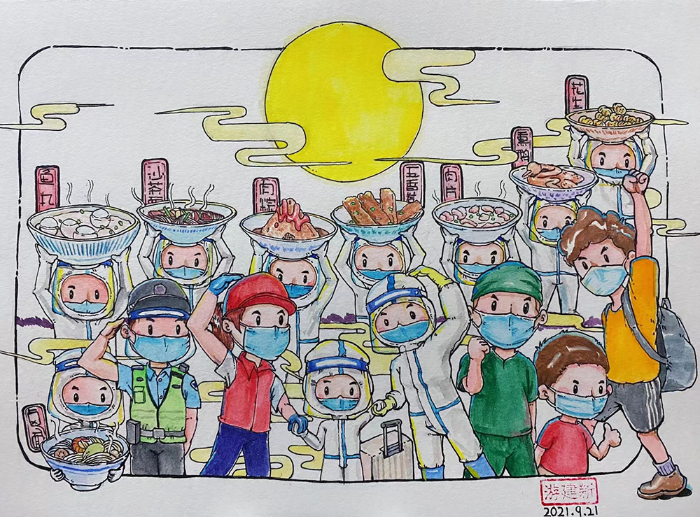 疫情来势汹汹,身为莆田人的他,并没有惊慌失措,因为他看到了“八闽一家亲”的团结。疫情伊始,福建省不少城市的白衣天使涌向莆田来支援。游建新十分感激所有对“莆田卤面”支援的“家人”。“大家在迎面对抗疫情时,全力相互配合、相互支持、相互鼓励,让我感受到正能量已经完全盖过大家对疫情的恐惧。”9月21日中秋节那天,一张特殊的画作出现在他的朋友圈——医护人员们拿着八种福建代表食物在圆月下一起过中秋,意为“八闽一家亲”。他说:“这个画面不是新闻画面,但一直浮现在我的脑海里,我想用这样的创作表达内心的感动。”