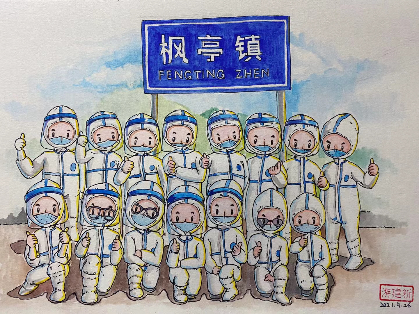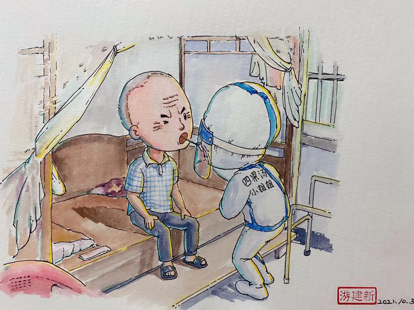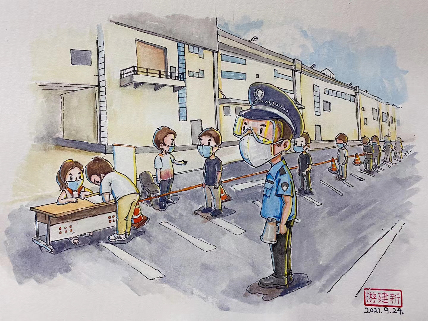 医护人员累到在路边小板凳上睡着、警察们在深夜依然坚守岗位、志愿者们无惧危险同心守护、小朋友对着核酸检测的工作人员敬礼……在莆田战疫期间,游建新用手中的画笔定格这些暖心瞬间。从9月19日至10月9日,他共创作了32张画作,向最美“逆行者”们致敬。