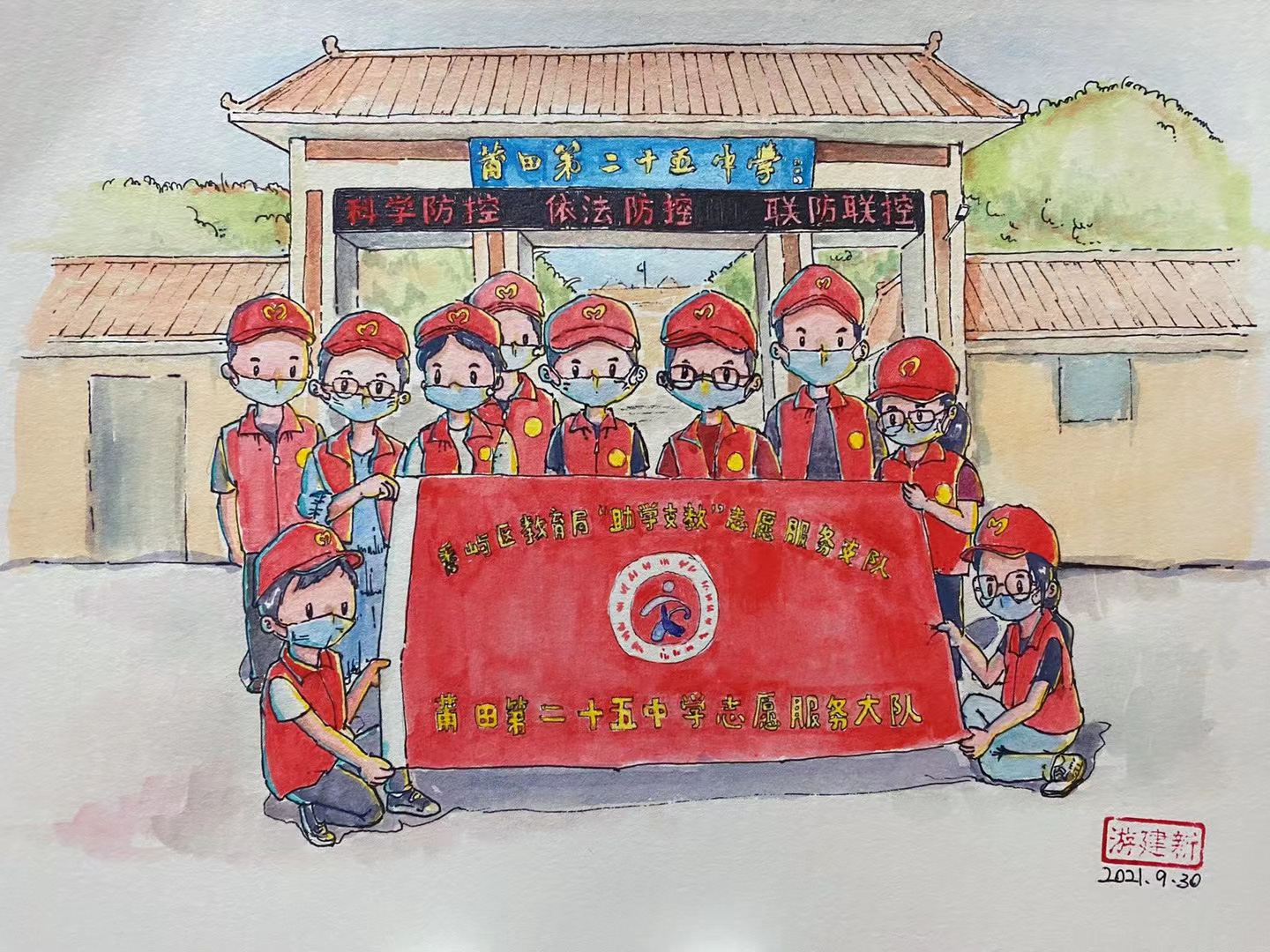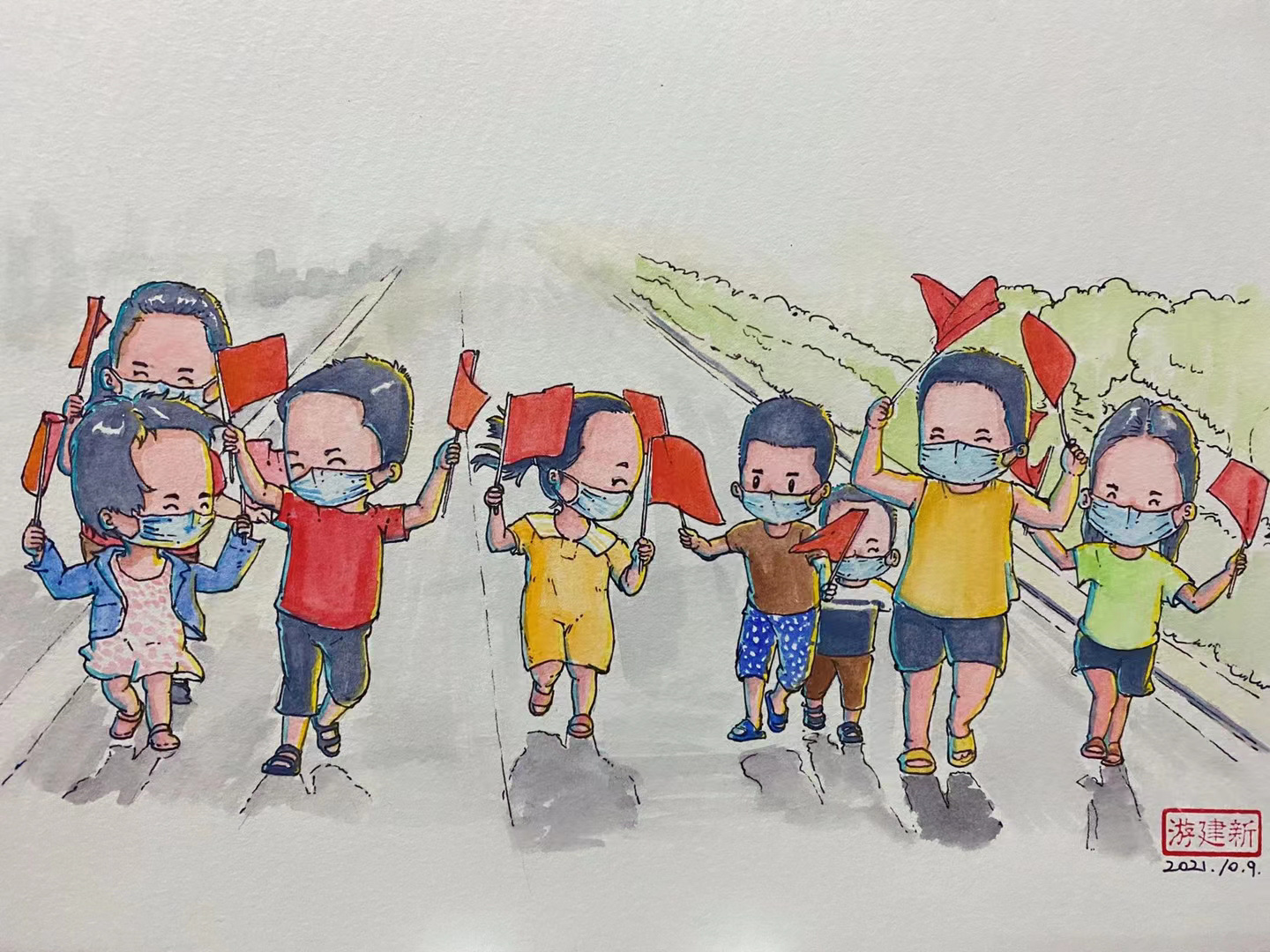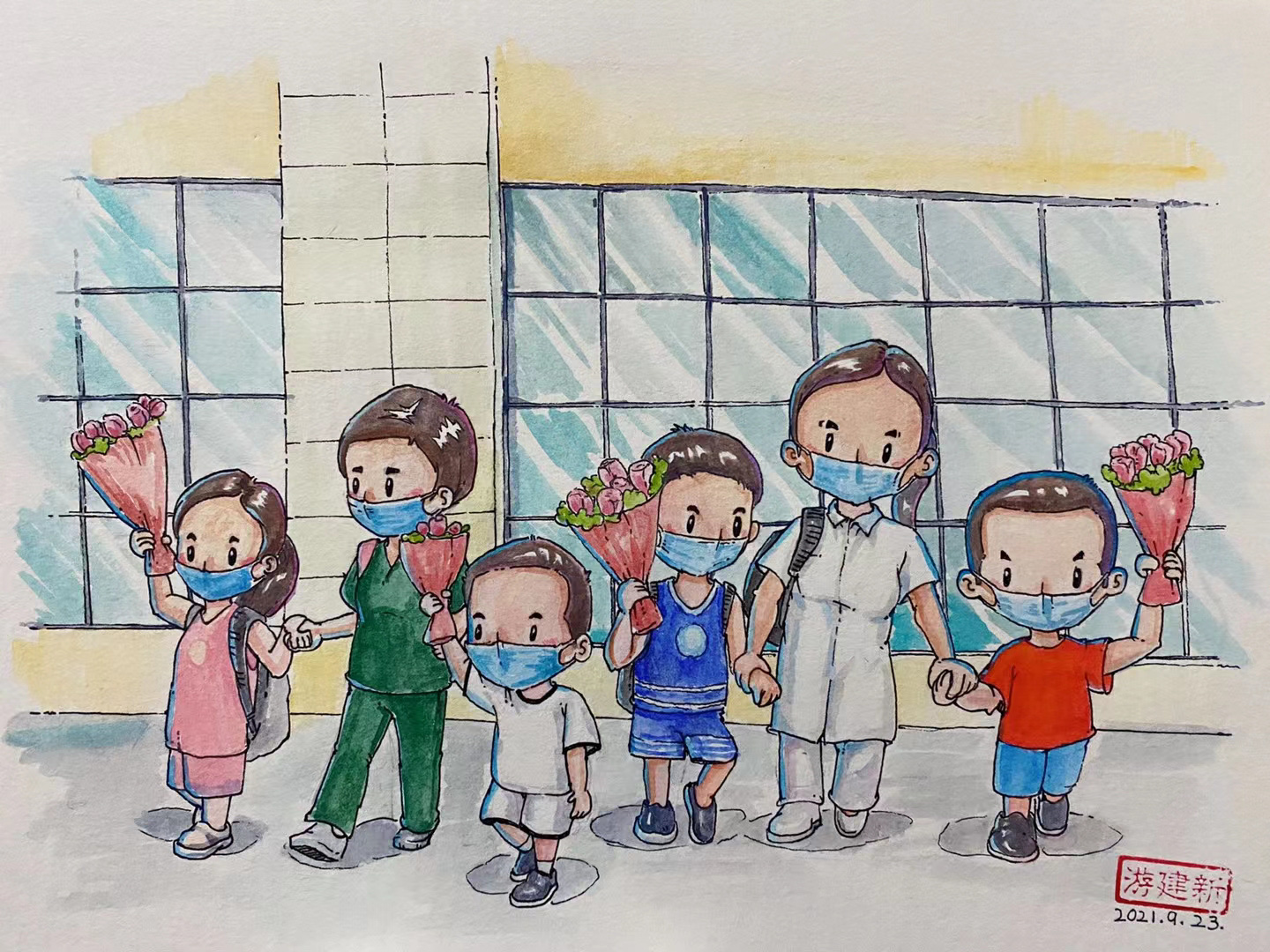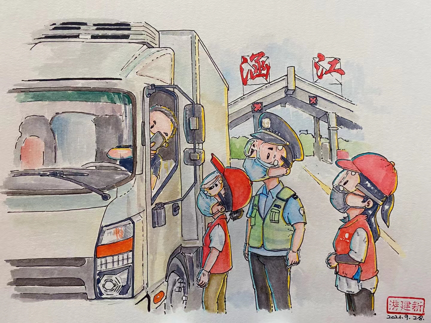 医护人员累到在路边小板凳上睡着、警察们在深夜依然坚守岗位、志愿者们无惧危险同心守护、小朋友对着核酸检测的工作人员敬礼……在莆田战疫期间,游建新用手中的画笔定格这些暖心瞬间。从9月19日至10月9日,他共创作了32张画作,向最美“逆行者”们致敬。