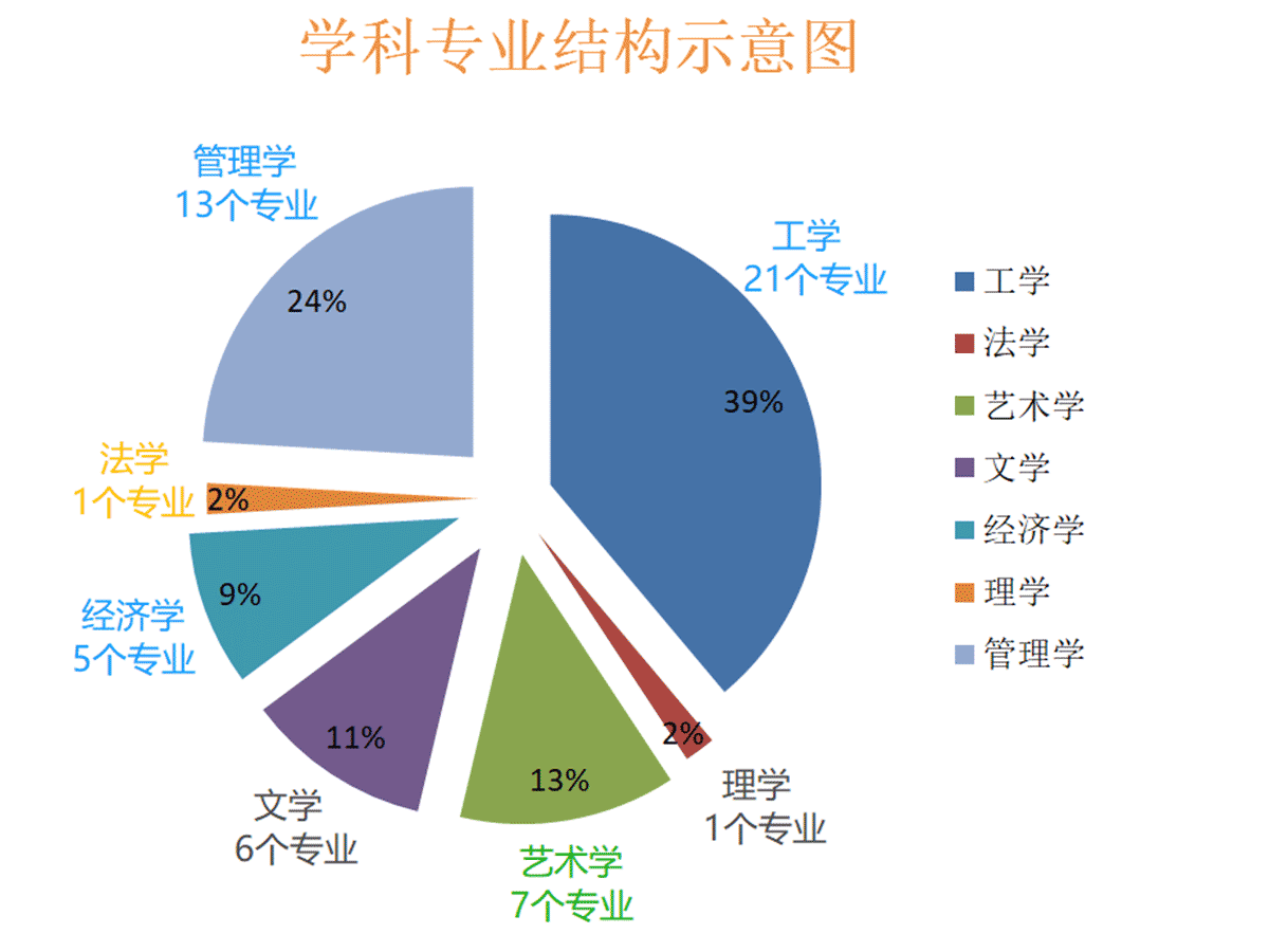 学校自创办之日起就确立了“面向人才市场办学,通过市场谋求发展”的战略思路,据此制定了学科专业建设总体规划,明确了各个不同发展阶段学科专业建设目标,努力构建与国家和区域经济社会发展形势相适应的学科专业结构体系。本科专业由2003年创办初期的9个专业发展到如今拥有54个本科专业,已初步形成门类多元、结构合理、协调发展的学科专业体系,并形成了优先发展应用类学科专业,重点发展工科专业,适时发展满足战略性新兴产业人才需求的学科专业,以及努力改革和发展传统学科专业等鲜明的学科专业建设特色。与此同时,学校以科学建构符合学院“应用型、复合型、创新型”人才培养目标定位的学科专业人才培养方案为突破口,以全面落实教学改革与教学质量工程建设为抓手,以形成一批突出实践应用、专业特色鲜明的学科专业为目标,坚持动态调整学科专业,扎实推进学科专业建设,不断提升和优化学科专业品质,使学校的学科专业建设获得鲜活的生命力,持续健康发展,学科专业整体实力明显增强。