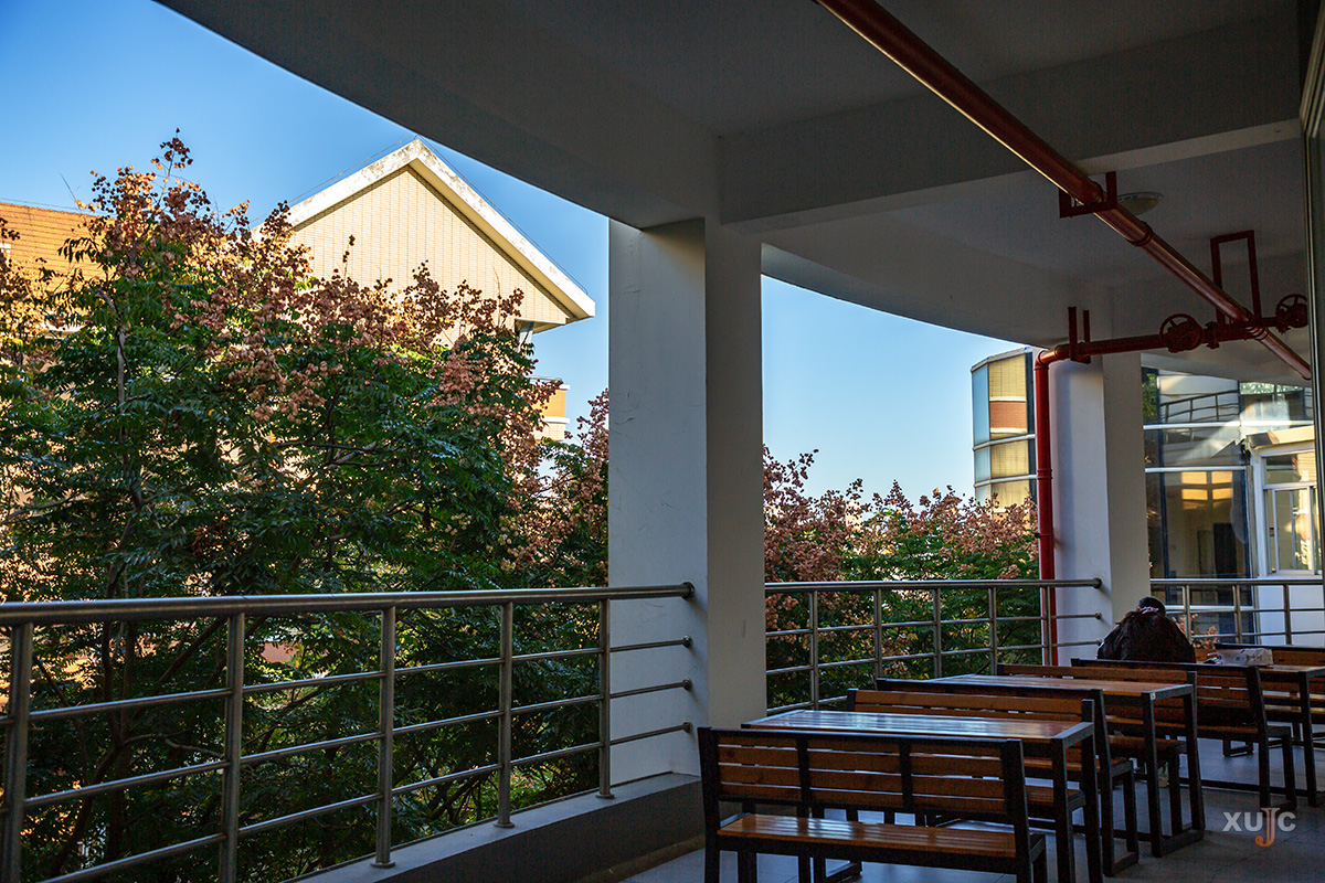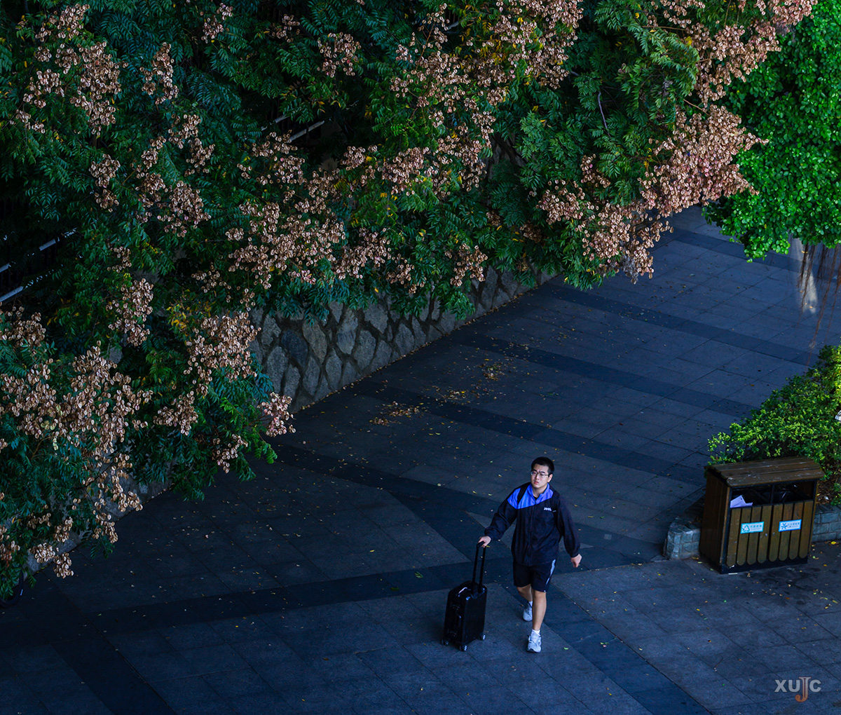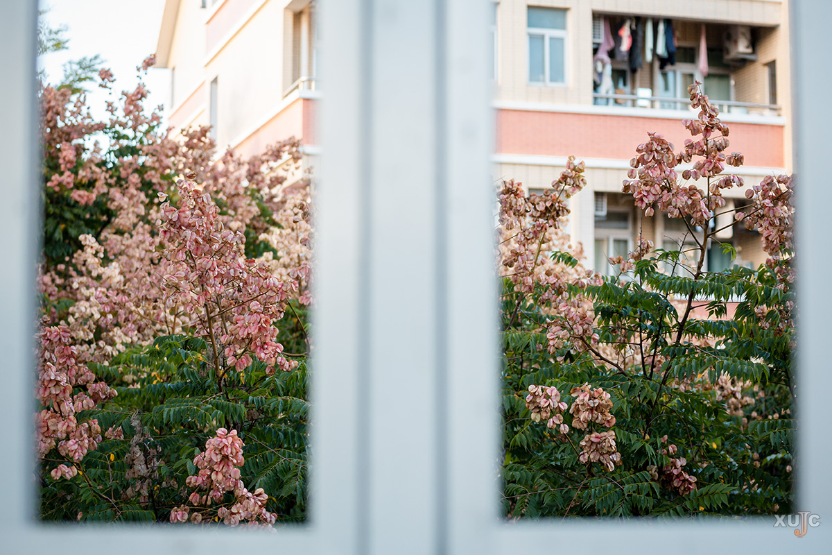 守在宿舍楼前的栾树与阳台飘动的衣影构成了一幅画