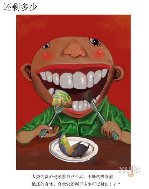 《还剩多少》画面中“他”怡然自得、兴致盎然,浑然不觉他正吞食着地球的身体。“触目惊心的画面,目的就是为了引起共鸣,唤起人们保护环境的意识,这也正是这次比赛的宗旨。”这幅作品是刘美霞经过了千万次的“雕琢”才最后定型的。“之前我的画面不是在吃地球,而是表现一个餐盘里吃剩下的树;后来觉得视觉冲击力不够,也有些牵强,临交稿才灵感突发,换成地球。”