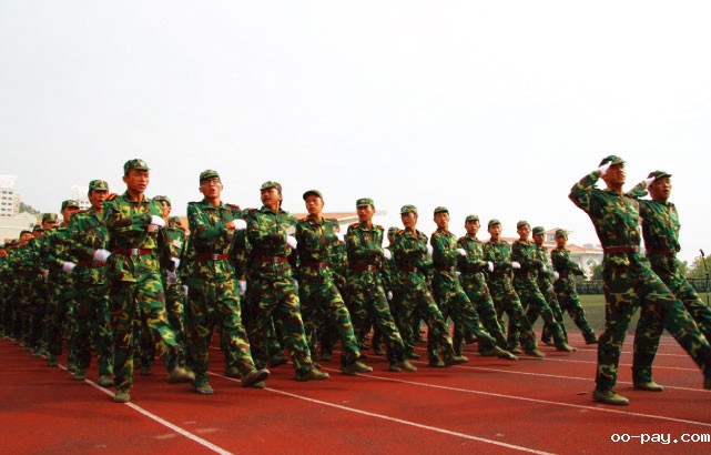站军姿,抬头,挺胸,一天下来,浑身酸痛。踢正步,腿绷直,脚尖离地约25厘米,向前摆臂,约与第三个衣扣同高,一定30分钟,腿酸,手也酸。