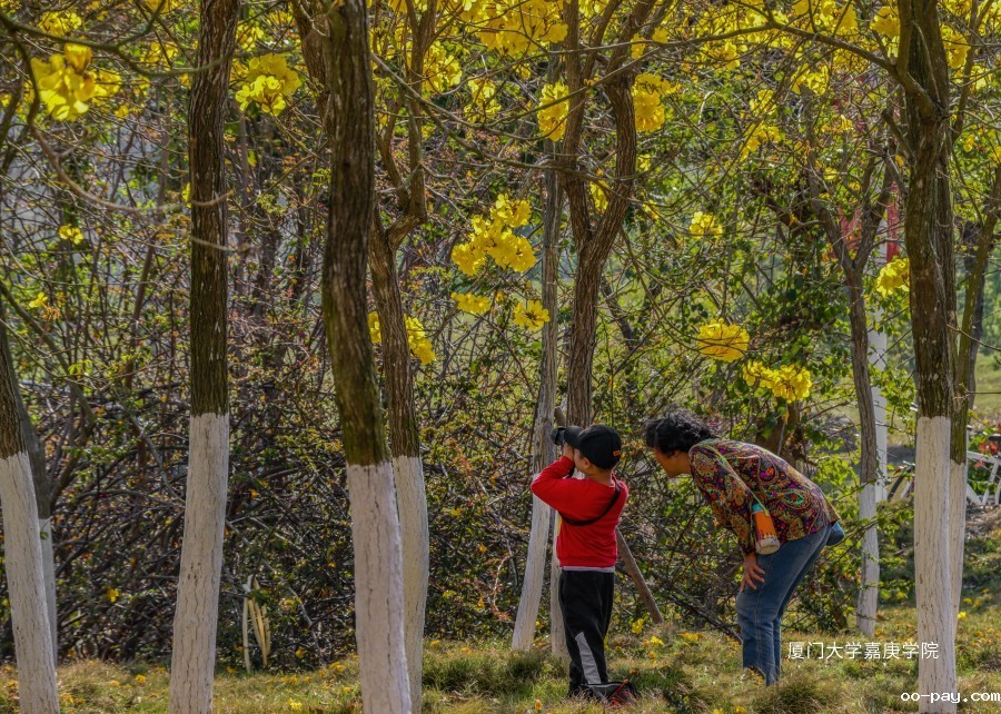 他注意到了正在盛开的黄花风铃木。