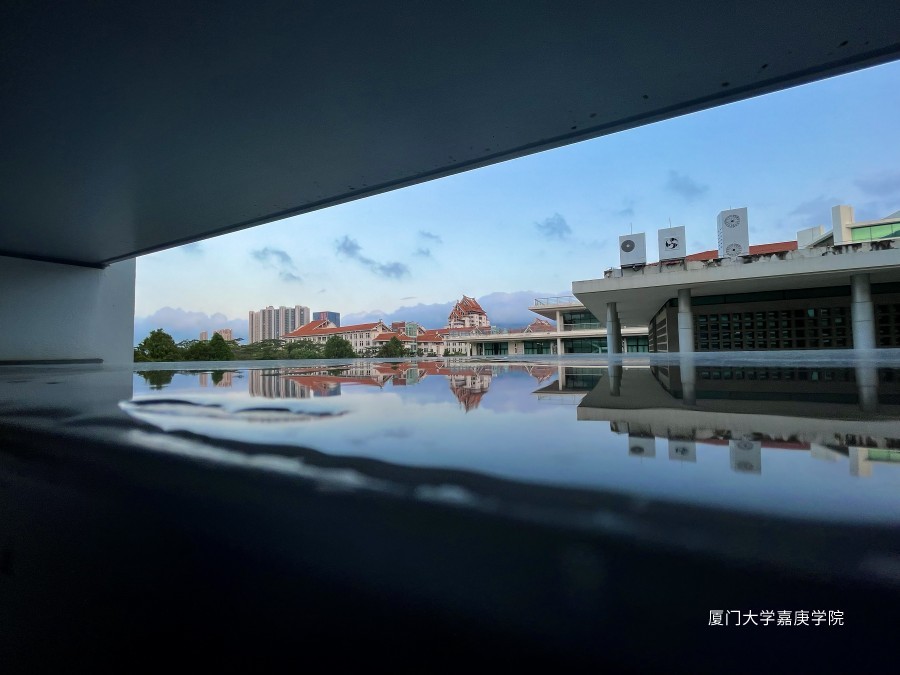 下完雨的嘉庚学院,栏杆上灌满了水,天空上飘着零零散散的云,给通透的天空增加了几分点缀;