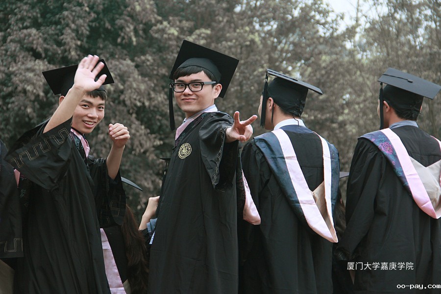 2010级国际经济与贸易专业毕业生陈文博与同学在拍集体毕业照前的被抓拍下的回眸一笑。