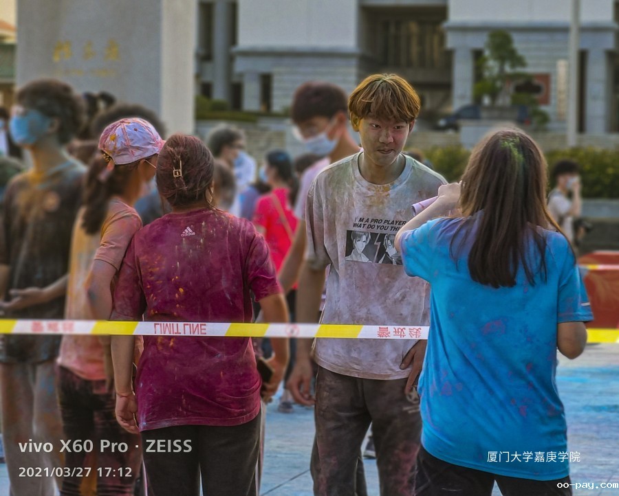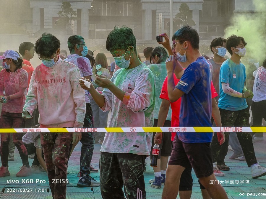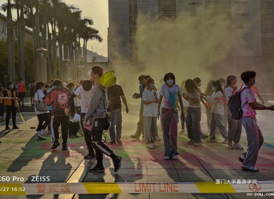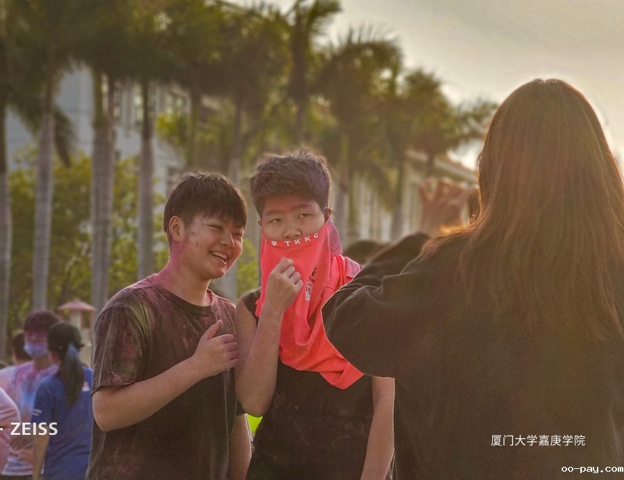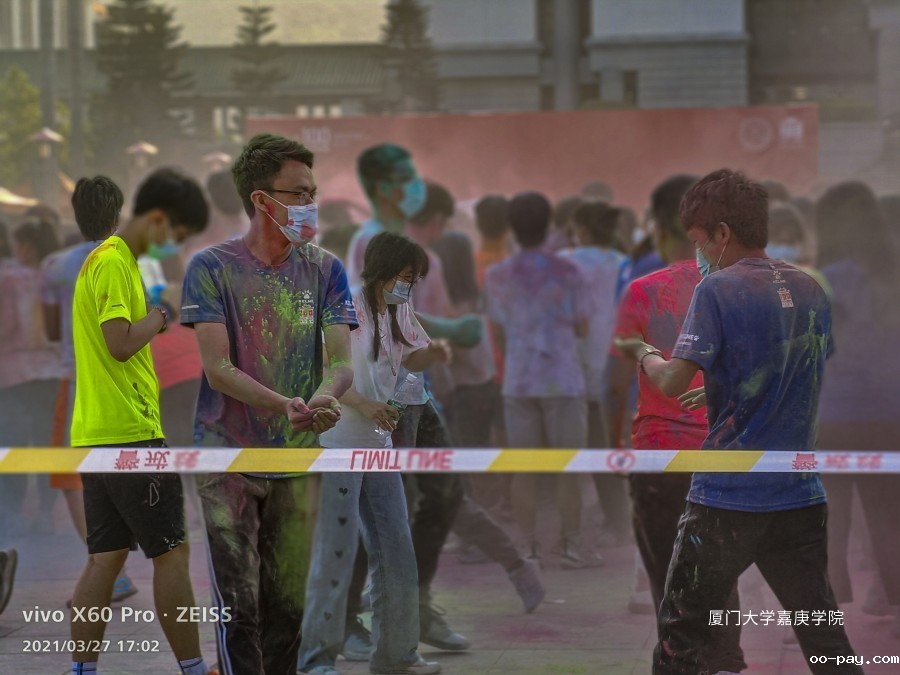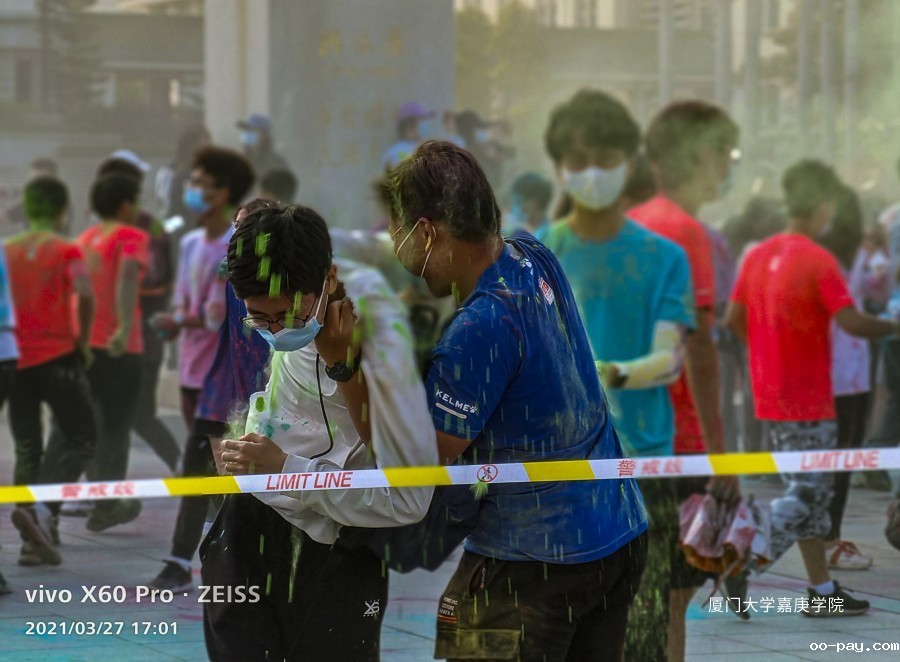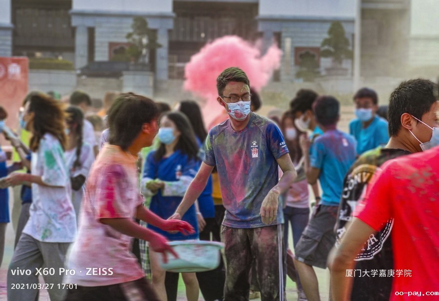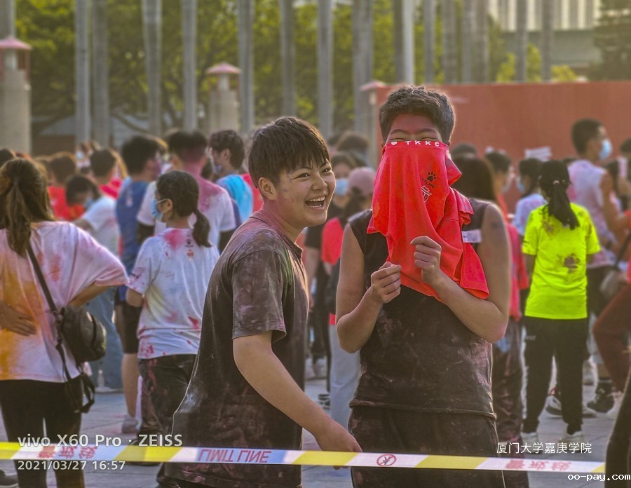 嘉庚学院彩虹跑投彩虹弹环节:作为线外人员的情绪被线内“嘉”人们无尽的欢乐感染着。彩虹粉末,勾勒彩虹世界,彩虹少年释放彩色的青春,而彩虹的尽头是“嘉庚”!