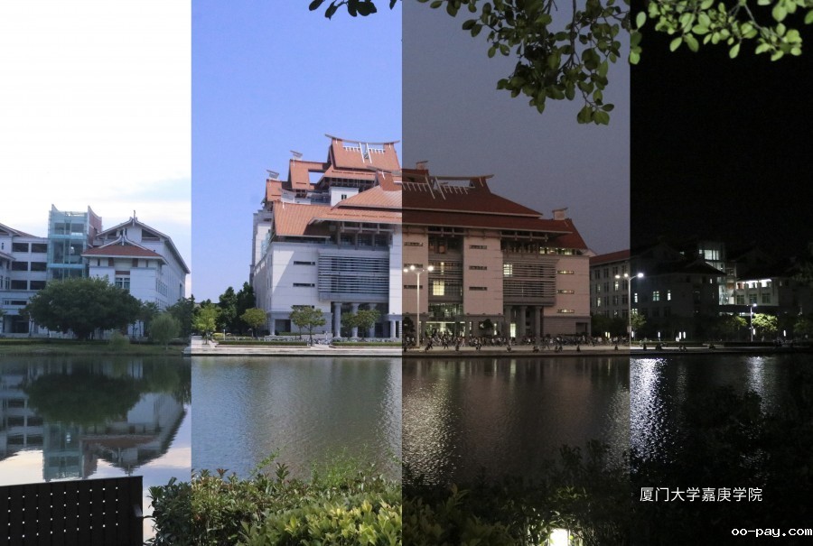 这张照片取景了四个时间点,清晨六点,午间两点,傍晚六点,晚上九点,四张均取自同一个点。这是我们眼中关于嘉主群楼最多模样的时间点,而我将这四个时间点叠加拼接为一张图片。