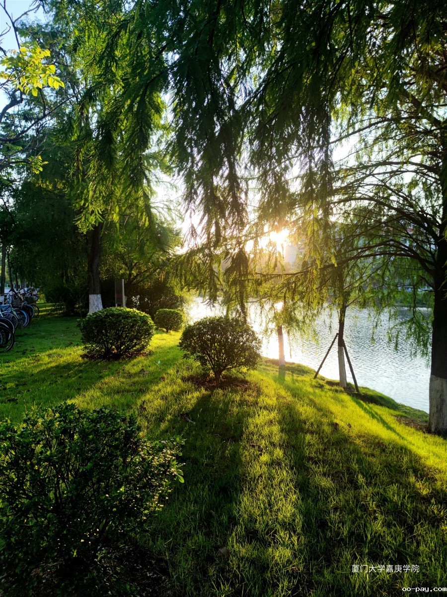 清晨的第一缕阳光透过树叶斑驳的洒在湖边