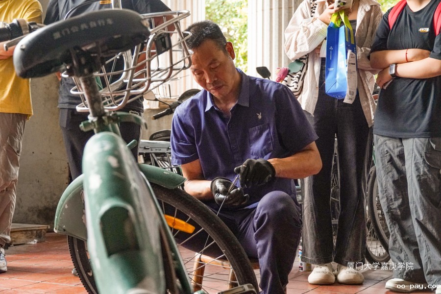 校内修车铺的爷爷教导志愿者们维修损坏的小绿