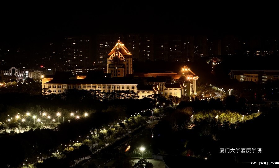 暖黄灯火勾勒出主楼群建筑的轮廓,独特的屋顶设计如鎏金冠冕,在漆黑夜色里熠熠生辉。周边楼宇灯火如星点缀,前景葱郁树影与道路光带交织,营造出静谧又富有层次感的氛围,静谧中藏着嘉园夜独有的浪漫和诗意。