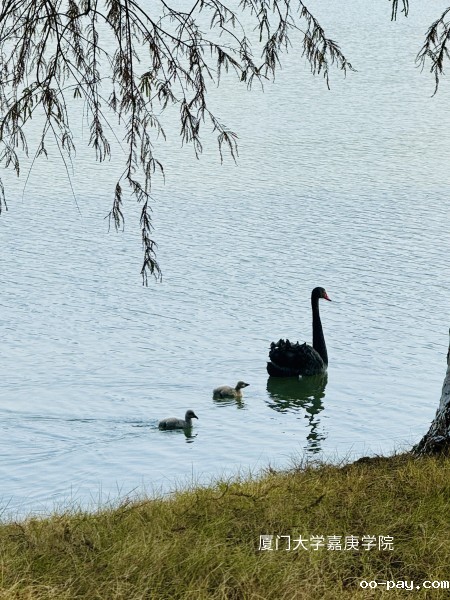 第三幅图,主体是一只黑天鹅和两只灰色的小天鹅,它们在水面上漂浮。黑天鹅位于画面右侧,长脖子,红喙,黑色羽毛,小天鹅在其左侧,一前一后。水面平静,泛起轻微波纹。上方有柳枝垂下,增加画面层次感。岸边草地呈黄绿色,位于画面底部。构图上,天鹅们在水面形成视觉焦点,柳枝和草地丰富了画面元素。整体色调柔和,营造出自然和谐的氛围。