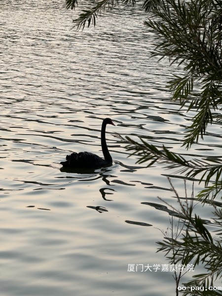 第一幅图,主体为一只在水面游动的黑天鹅。画面整体色调柔和,呈现出暖黄色调,水面泛起层层波纹。黑天鹅全身黑色羽毛,姿态优雅,位于画面中央偏左位置,它的倒影清晰地映在水面,增添了画面的对称美感。画面右上角和右下角有树枝枝叶,形成自然的框架构图,简洁的布局突出了黑天鹅的孤独与优雅。