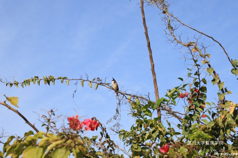 在蓝天、绿叶和红色三角梅的映衬下,鸟儿眺望着远方。