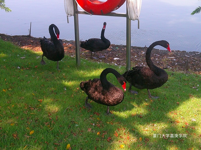 栖霞凌波映黑鹅,静享湖畔好时光。