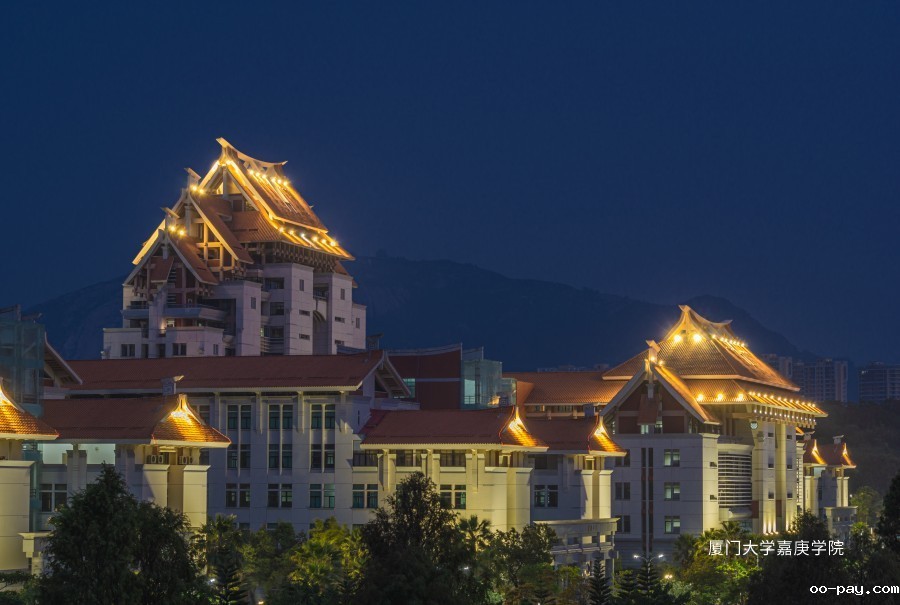 夜晚刚刚到来,天还没完全黑。主楼华灯初上,光影很美丽