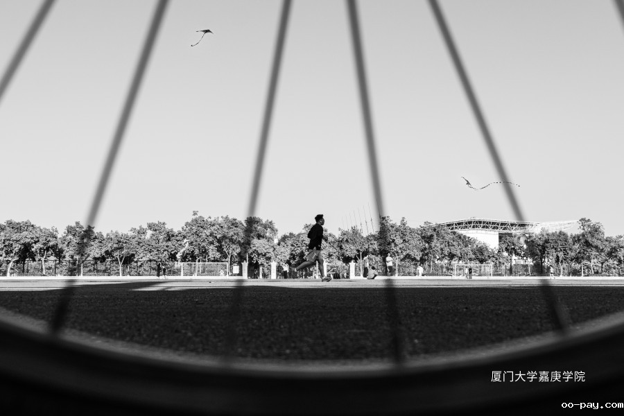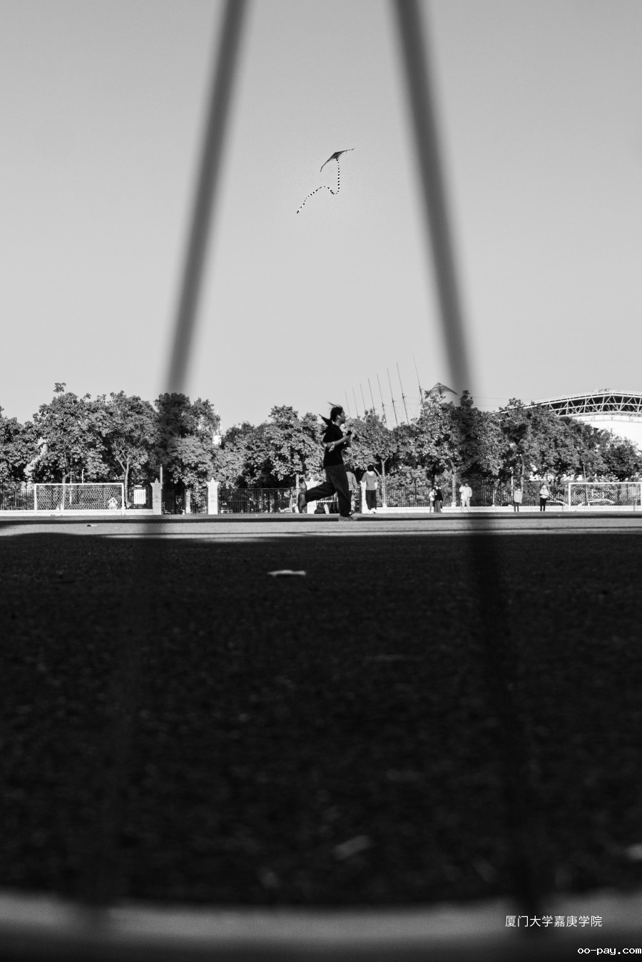 下午在操场上跑步的人,与空中风筝组成了三角形。