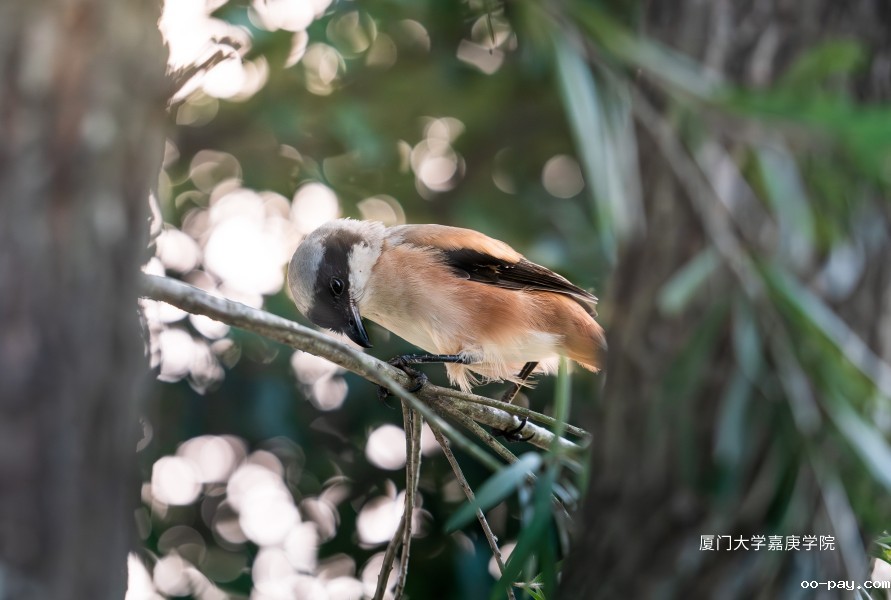 伯劳鸟在湖畔的树上伺机出动,偶尔看见它在湖畔吃着小鱼
