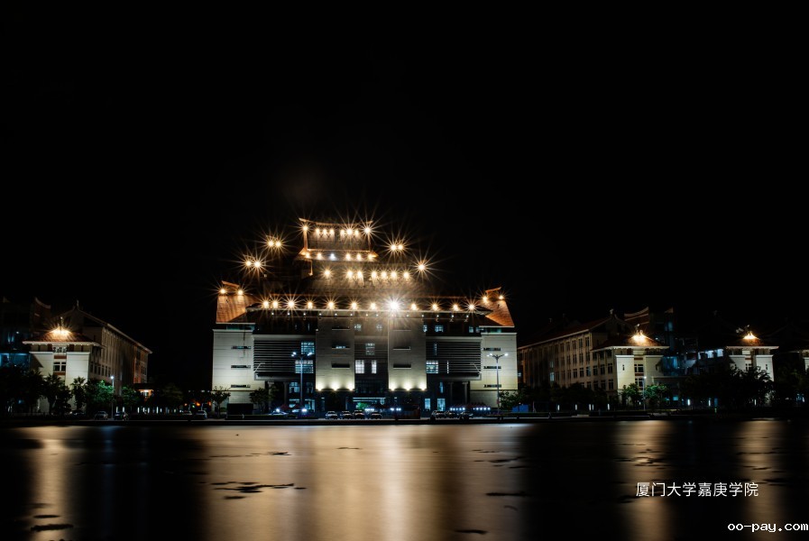 主楼群在柔和而温暖的灯光下熠熠生辉,展现出传统亚洲风格的优雅与庄重。金色的尖顶和翘角在夜色中更显尊贵,外墙上的金色图案在灯光的映照下更添一份神秘与辉煌。
