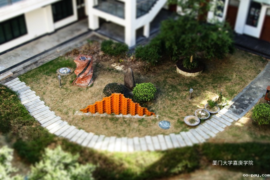 移轴效果将人文楼院落一隅变成精致的微型景观,艺术装置的点睛、盎然绿植与石板小径的幽静相得益彰