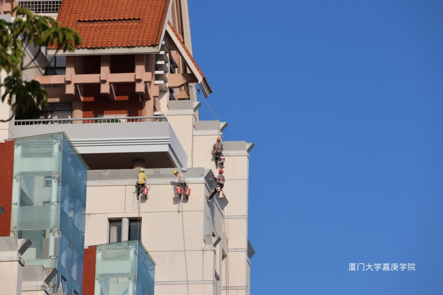 蓝天为幕,楼宇为景,工匠身处其间,悬停在高空,展现劳动者的无畏与坚守。