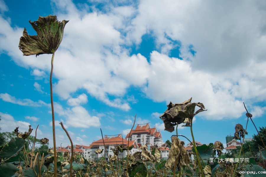 当走在荷花池中,蓝天包围着“嘉园”的主楼群,用柔软的白云去抚摸它。