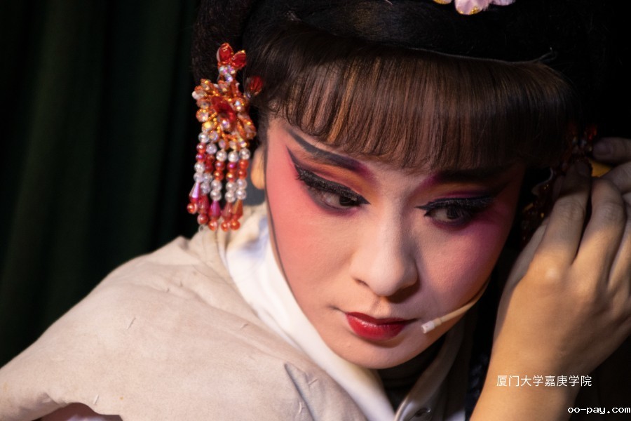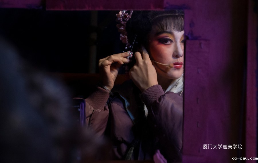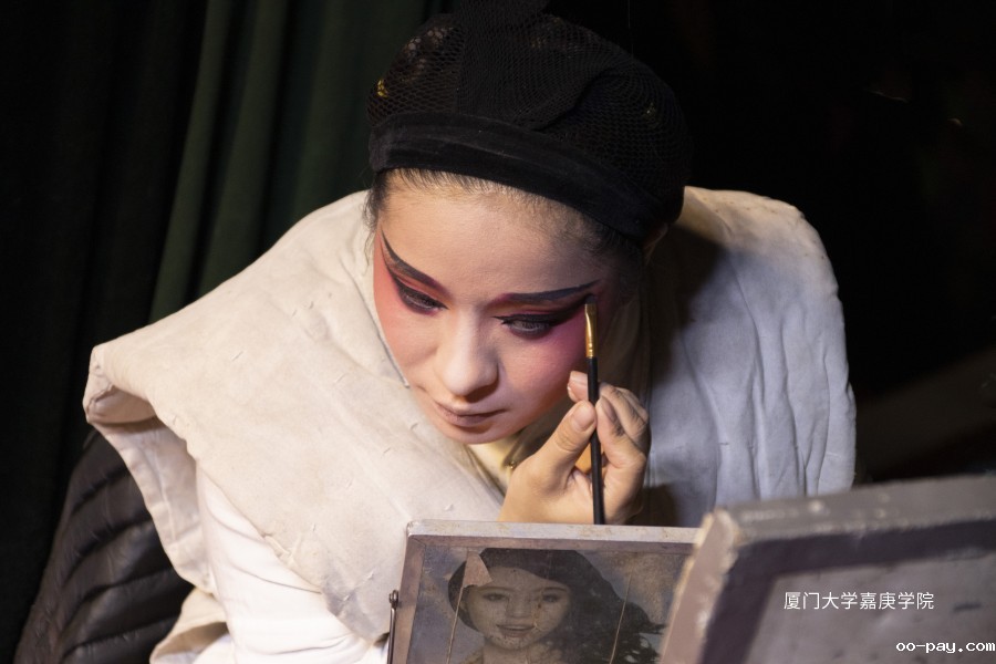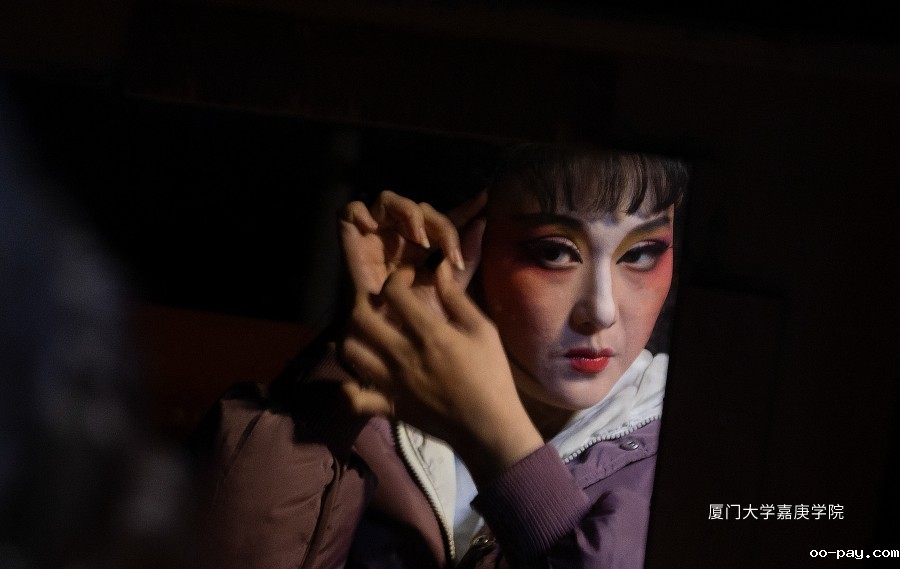 表演开始前,芗剧艺术团的演员们在后台精心梳妆打扮,准备粉末登场,一笔一划,皆是入戏。