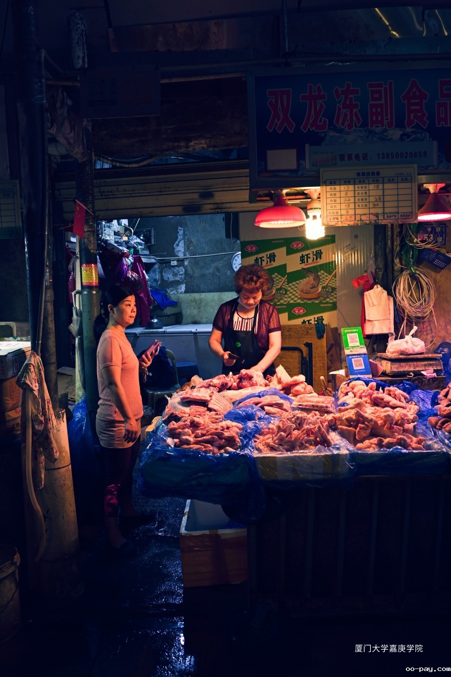 微微的灯光下一位卖肉的妇女在一刀一刀地为顾客切肉