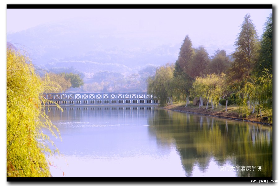 在一个秋季的雾天,远山,近水,小桥,倒影,交叠出如仙境般的嘉园景色。