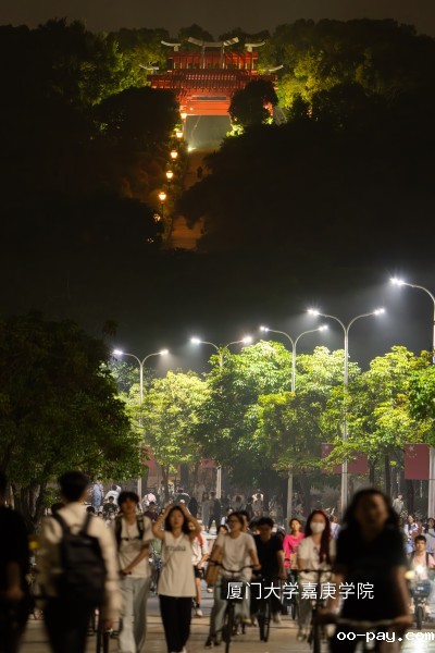 背景为夜幕中的至善亭,前景为晚课放学后熙熙攘攘的学生