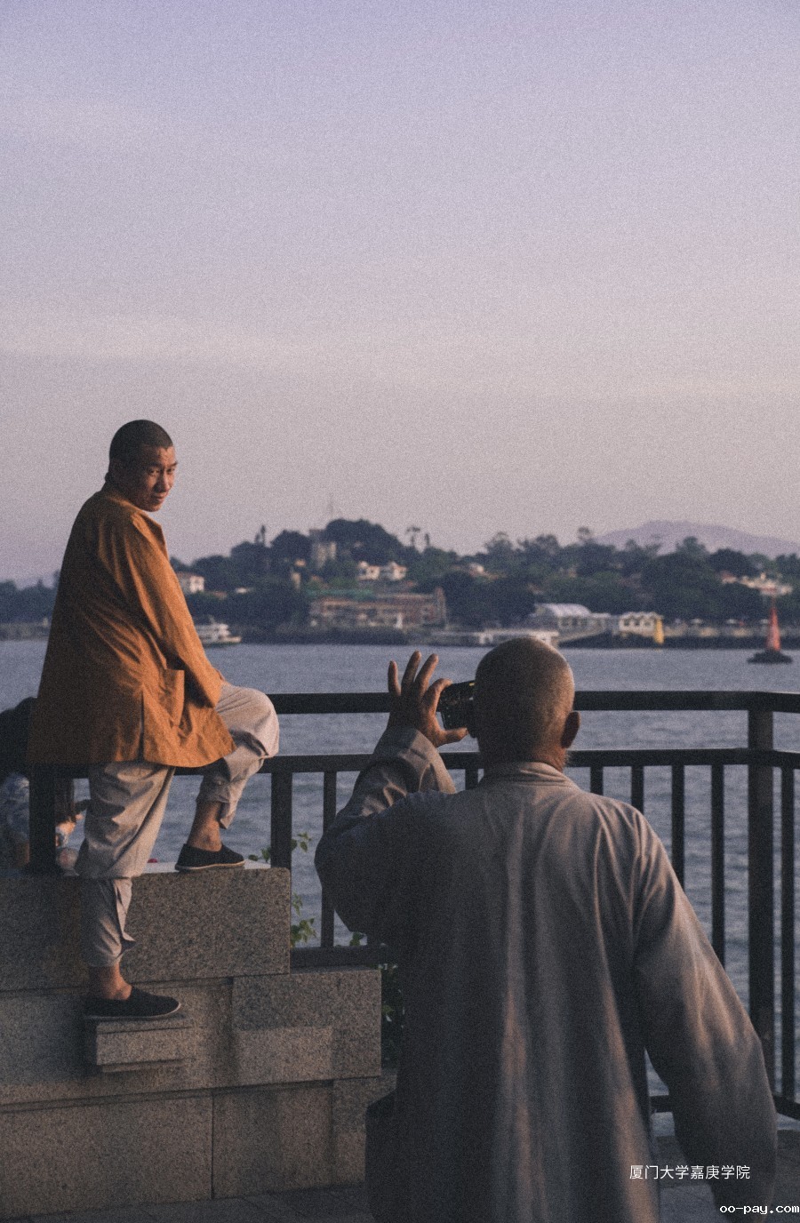 于2020年拍摄于厦门鼓浪屿码头。当时在海边等落日余晖,侧眼发现两位僧侣正在拍照。望着僧侣脸上洋溢的笑容,我不禁感叹这不仅是一种缘分,更是生活美好的真实写照。