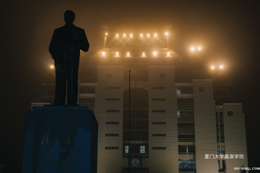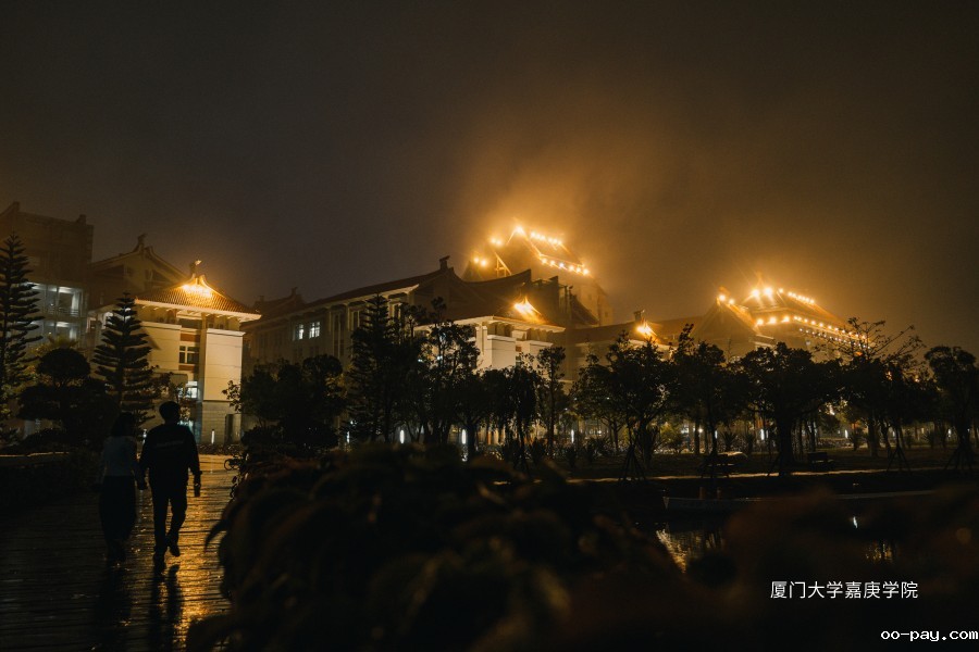 厦门大学校庆之夜,睡在雨和雾中的灯火通明的“嘉”,平静而美丽。