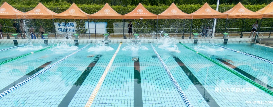 橙伞撑起夏的热烈,泳池似沸腾的海洋。