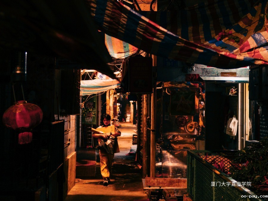 作品远方是现代的城市建筑,近处是狭窄的街道和一位拿着快递的男人,生活不止有眼前的苟且,更有诗和远方。