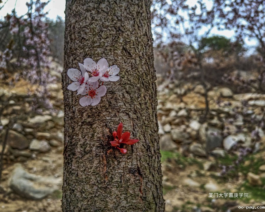 一个不经意的转身,我发现了这簇樱花和新生的叶子。它们不屑长在枝丫上与兄弟姊妹争奇斗艳!它们相守在母亲的一方躯干。它们在母亲的躯干上萌发,它们不起眼,它们又最起眼!