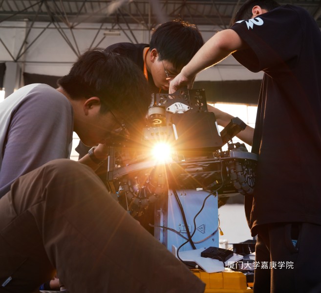 傍着落日余晖,嘉庚学子们在赛前努力调试着机器人