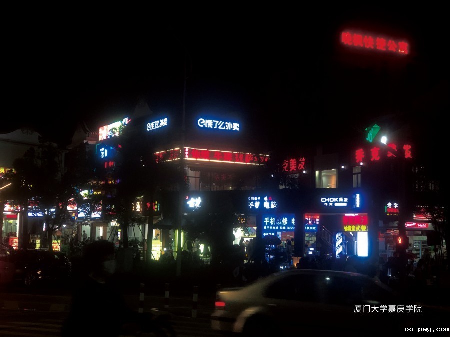 道路上缓慢的车辆,沿街的地摊商贩,夜灯下的小吃招牌,共同勾勒出“嘉园”外的夜晚。