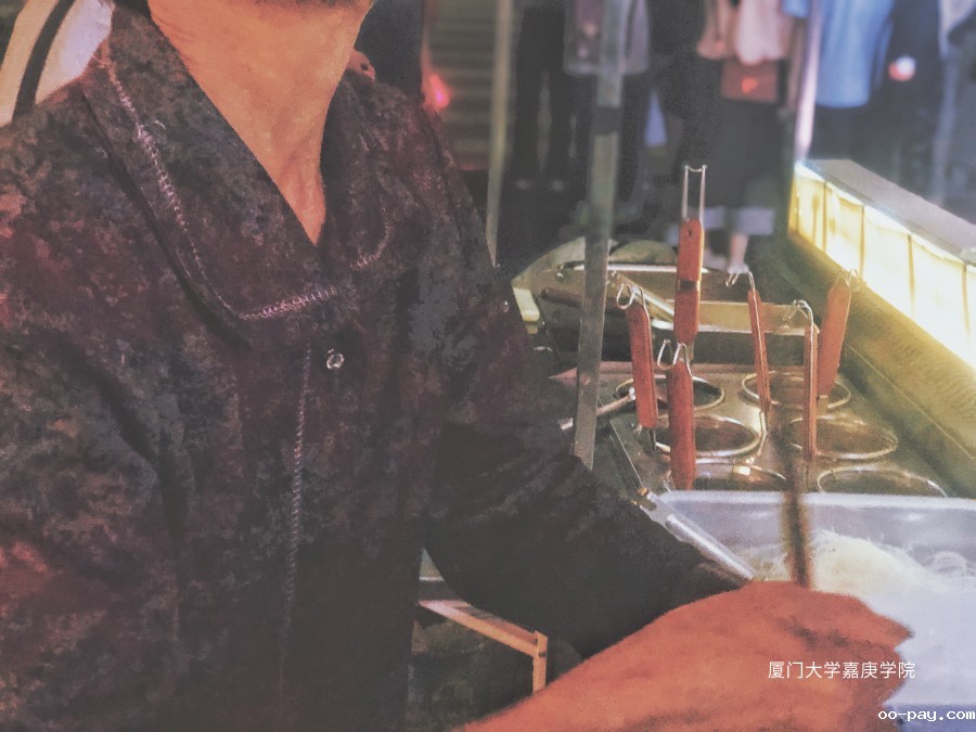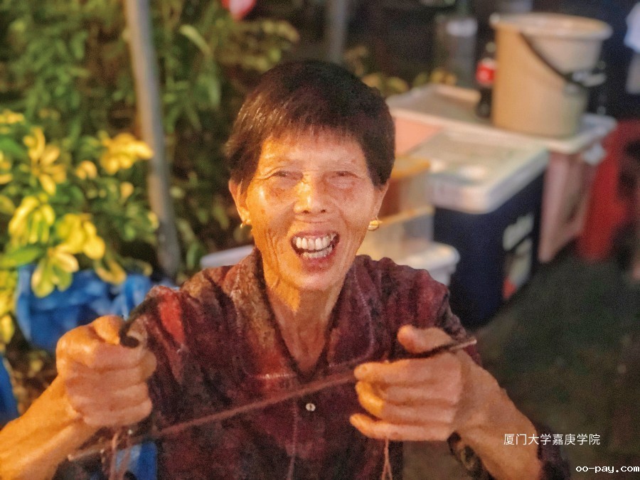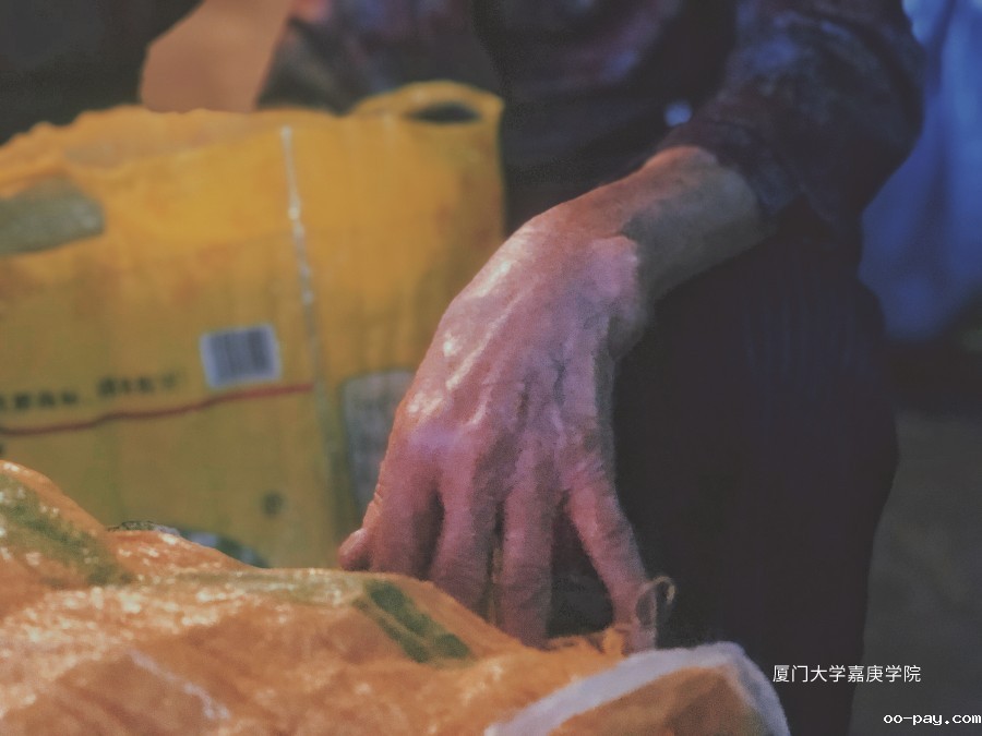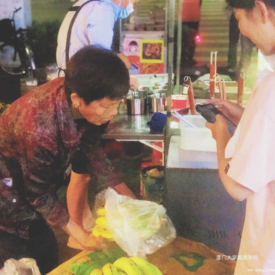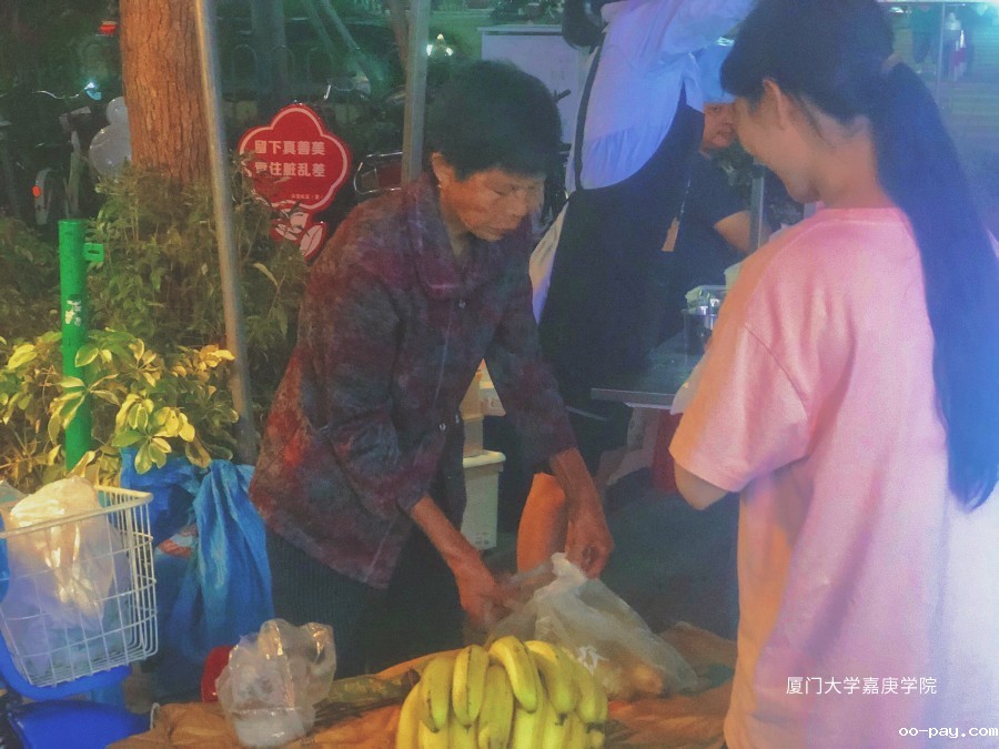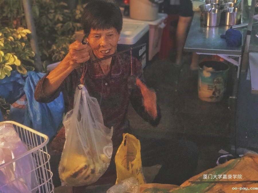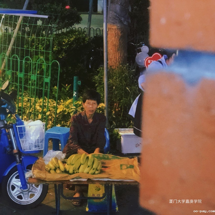 在“嘉”北区校门口过马路后,有一个婆婆经常带着自己种的香蕉、荔枝和杨梅售卖,年老的身躯,颤抖的双手和眼角的沟壑,沧桑的面庞下总含着笑意面对来往的学生,手里的一杆秤,陪伴了她数十年……