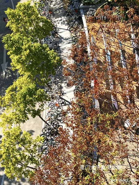 黄绿树枝间,单车整齐排列,是学子奋斗日常的温暖注脚。